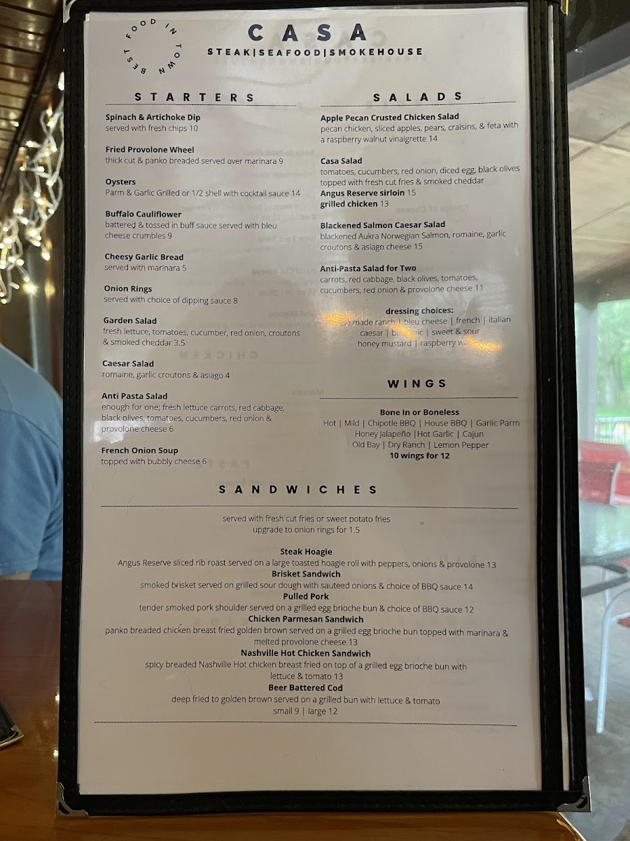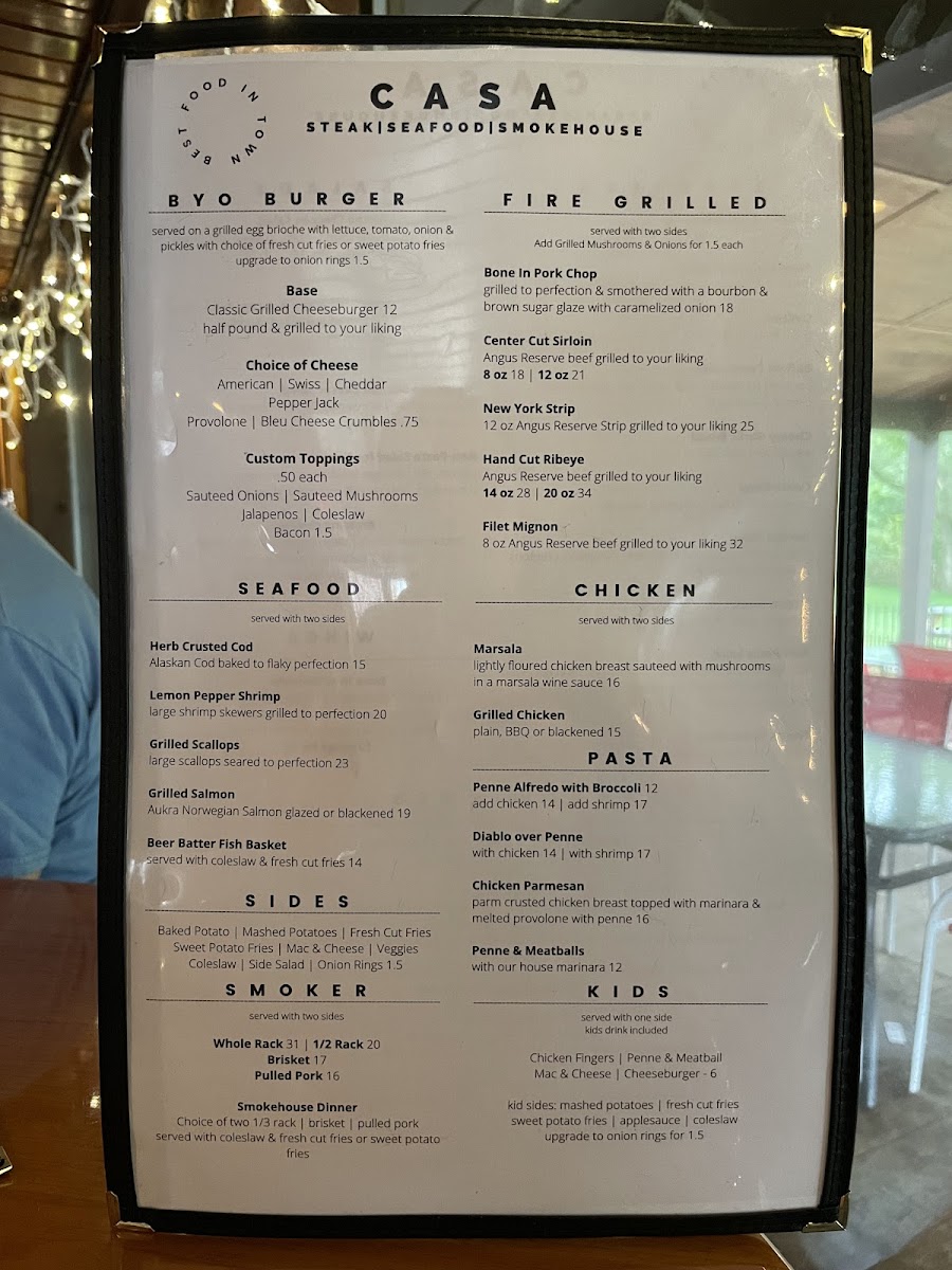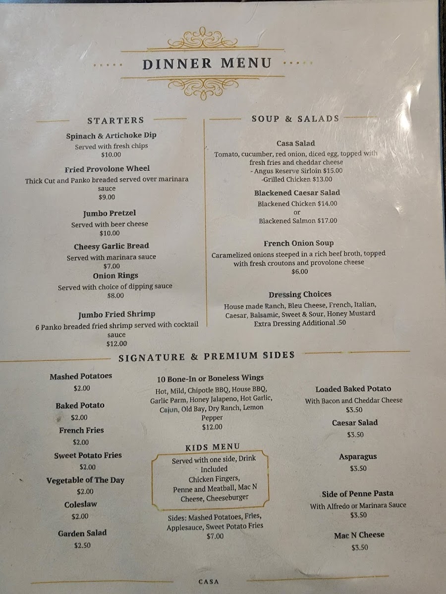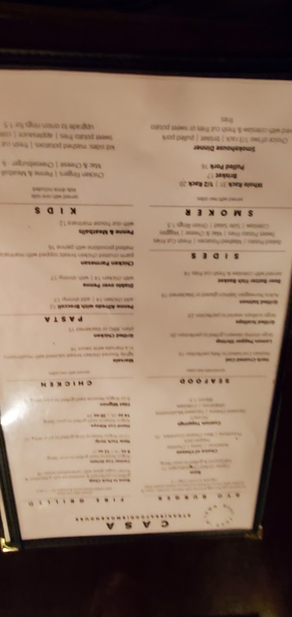 The menu at Casa Steak Seafood And Smokehouse presents a well-balanced snapshot of what the restaurant aims to do best, combining hearty steakhouse traditions with smokehouse depth and seafood freshness. Premium cuts like the Ribeye Steak and Filet Mignon stand out as the backbone of the menu, cooked with an emphasis on flavor and texture rather than unnecessary embellishment. The smokehouse section adds character through dishes such as Smoked Brisket and House Smoked Ribs, where slow cooking and seasoning create rich, comforting profiles that appeal to guests looking for bold, satisfying meals. Seafood options, including Grilled Salmon and the Seafood Platter, offer a lighter yet equally polished contrast, showcasing careful preparation that preserves natural taste while complementing it with simple sides. Starters and sides are designed to support the mains without stealing attention, reinforcing the menu’s cohesive structure. Desserts like Classic Cheesecake provide a familiar, well-executed finish rather than an overly experimental one. Overall, the menu feels thoughtfully curated, reflecting consistency, approachability, and a clear focus on quality proteins, making it easy for diners to navigate and leave with a strong impression of balance and reliability.